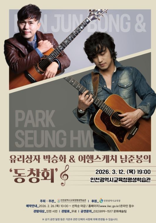 (포탈뉴스통신) 인천광역시교육청평생학습관은 시민의 다양한 문화예술 향유를 위하여, 3월 12일 교육누리홀에서 ‘유리상자 박승화 & 여행스케치 남준봉’ 음악 공연을 개최한다.