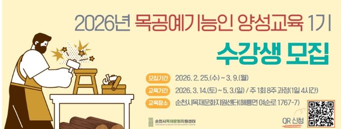 (포탈뉴스통신) 순천시는 시민들의 목공 체험 기회를 확대하고 목재문화 활성화를 위해 ‘2026년 목공예기능인 양성교육 1기’ 수강생을 오는 3월 9일까지 모집한다고 밝혔다.