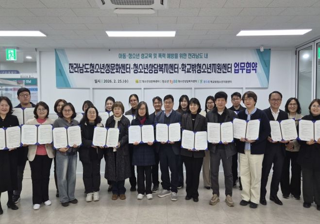 (포탈뉴스통신) 전라남도청소년성문화센터는 전라남도청소년상담복지센터·전라남도학교밖청소년지원센터를 비롯하여 22개 시․군 ‘청소년상담복지센터·학교밖청소년지원센터’와 2월 25일 업무협약을 체결했다.