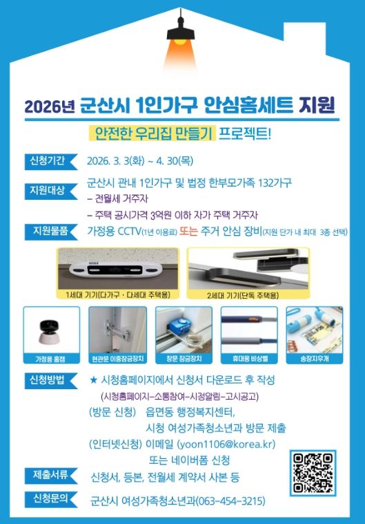 (포탈뉴스통신) 군산시는 1인 가구와 한부모가족의 주거 안전 강화를 위해 ‘2026년 군산시 1인가구 안심홈세트 지원사업’을 추진하고, 3월 3일부터 4월 30일까지 대상자를 모집한다고 밝혔다.