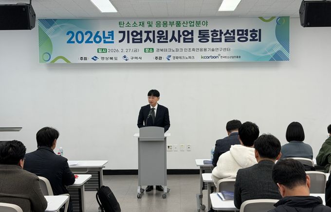 (포탈뉴스통신) 경상북도는 27일 구미시 산동읍에 위치한 경북테크노파크 인조흑연응용기술연구센터에서 도내 기업 및 유관기관 관계자 50여 명이 참석한 가운데 '2026년 탄소산업 기업지원사업 통합설명회'를 개최했다.