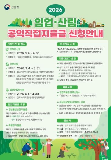 공익직불금은 농업인의 안정적인 소득 기반을 마련하고 환경 보전, 농촌 유지 등 농업의 공익적 가치를 높이기 위한 제도로, 신청은 온라인(인터넷·스마트폰), ARS(1334), 읍·면·동 행정복지센터 방문을 통해 가능하다.