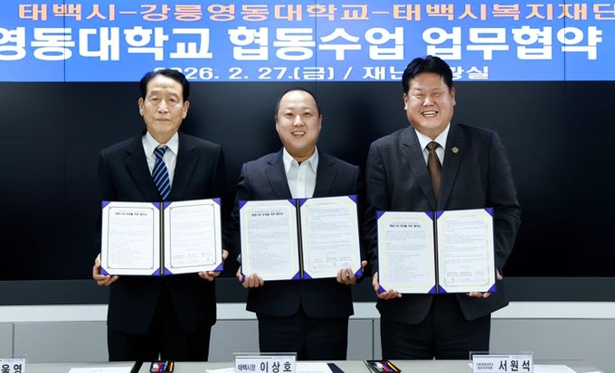 (포탈뉴스통신) 태백시는 2월 27일 강릉영동대학교, 태백시복지재단과 함께 지역 인재 양성과 현장 기반 교육 강화를 위한 협동수업 운영 업무협약을 체결했다고 밝혔다.
