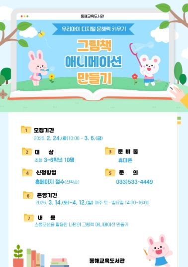 (포탈뉴스통신) 동해교육도서관은 초등학생의 창의적인 독서활동과 미디어 활용 역량 강화를 위해 ‘그림책 애니메이션 만들기’를 운영한다.