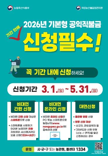 (포탈뉴스통신) 금산군 농업·농촌의 공익기능 증진과 농업인의 소득 안정을 위한 2026년도 기본형 공익직접지불금 등록을 오는 5월 31일까지 접수한다.