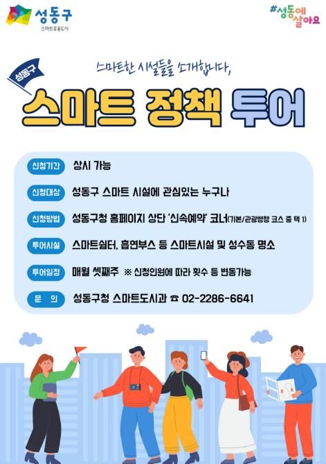투어는 매월 셋째 주에 진행하며 신청 인원 등에 따라 일부 조정될 수 있다. 참여 신청은 성동구 스마트 시설에 관심 있는 누구나 성동구청 누리집(홈페이지) 상단의 ‘신속예약’코너를 통해 할 수 있다. 단체 신청 등 기타 자세한 사항은 성동구청 스마트도시과로 문의하면 된다.