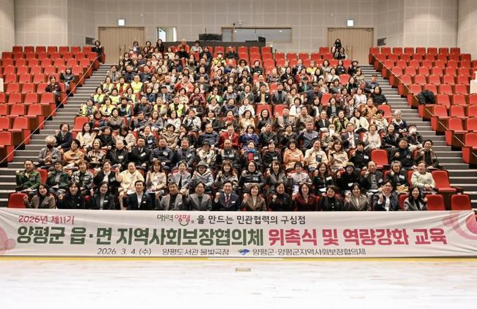 (포탈뉴스통신) 양평군은 지난 4일 양평도서관 물빛극장에서 250여 명이 참석한 가운데 ‘2026년 제11기 읍면 지역사회보장협의체 위촉식 및 역량 강화 교육’을 개최하고, 지역 맞춤형 복지안전망 강화를 위한 본격적인 활동에 들어갔다고 밝혔다.