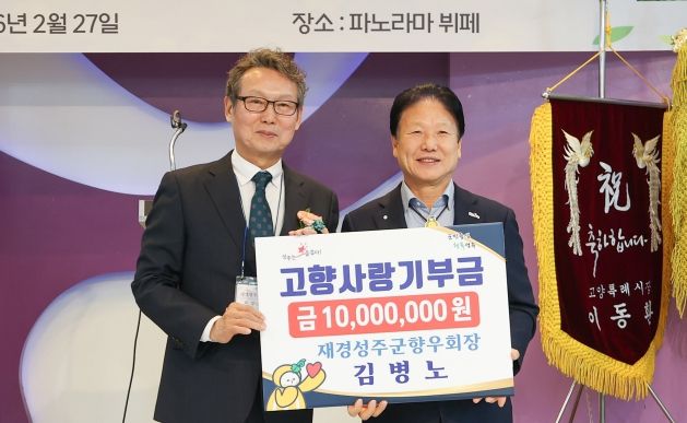 (포탈뉴스통신) 재경성주군향우회 김병노 회장이 지난달 27일 서울 종로구에서 열린‘2026년 재경성주군향우회 신년 교례회’에서 고향 발전을 위한 고향사랑기부금을 1,000만 원 기탁했다.