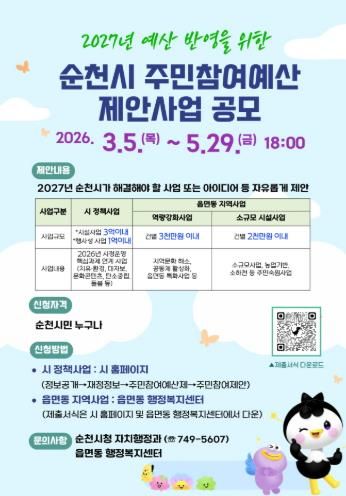 (포탈뉴스통신) 순천시는 2027년도 예산편성 과정에 시민의 다양한 의견과 아이디어를 반영하기 위해 3월부터 5월까지 주민참여예산 제안사업을 접수한다고 밝혔다.