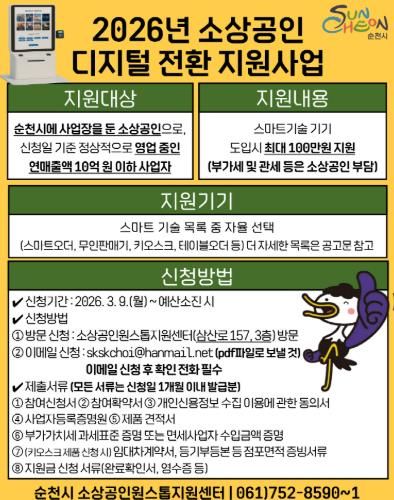 신청 기간은 오는 9일부터 예산 소진 시까지이며, 순천시 소상공인원스톱지원센터(삼산로 157, 3층)를 방문하거나 이메일로 접수하면 된다.