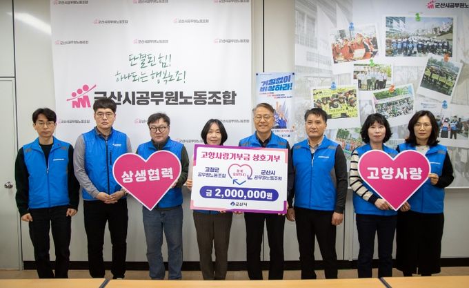 군산시공무원노동조합 사무실에서 5일 열린 기탁식에는 양 노조 위원장 및 임원 각 20명씩 총 40명이 자발적으로 참여해 고향사랑기부제의 취지를 공감하고 지속적인 교류와 협력을 이어가기로 뜻을 모았다.