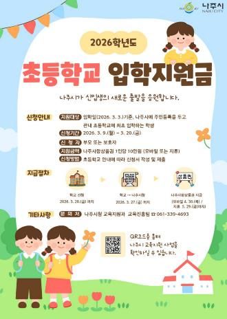 나주시는 2026년 초등학교 입학일인 3월 3일 기준 나주시에 주민등록을 두고 계속 거주하면서 관내 초등학교에 최초 입학하는 신입생을 대상으로 입학지원금을 지원한다고 5일 밝혔다.