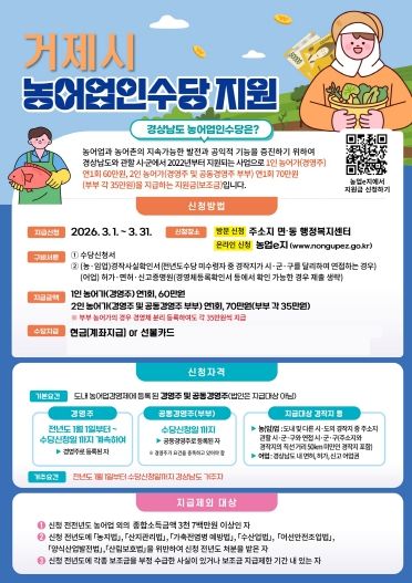 (포탈뉴스통신) 거제시는 농어업·농어촌의 공익적 기능을 유지·증진하고 농어업인의 소득 안정을 지원하기 위해 ‘2026년 농어업인수당’ 신청을 3월 1일부터 3월 31일까지 접수하고 있다.