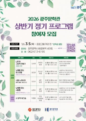 (포탈뉴스통신) 광주광역시는 시민의 문학적 감수성과 창작 역량을 키우기 위해 ‘2026년 광주문학관 상반기 정기 프로그램’을 운영한다.