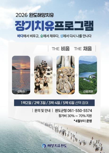 (포탈뉴스통신) 완도군에서는 4월부터 해양치유 활성화 및 효과 검증, 생활 인구를 확대하기 위해 ‘장기 체류형 해양치유 프로그램’을 운영한다.