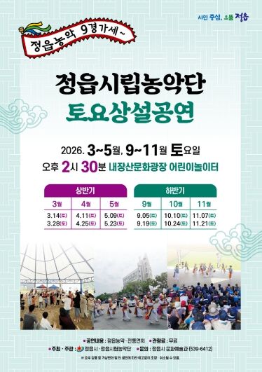 이학수 시장은 “정읍농악만의 다양하고 특화된 프로그램을 알차게 준비해 관람객들의 큰 호응을 이끌어낼 계획”이라며 “앞으로도 수준 높고 다채로운 무대를 꾸준히 선보여 시민들에게 변함없이 사랑받는 토요 상설공연으로 자리매김하도록 최선을 다하겠다”고 전했다.