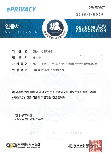 (포탈뉴스통신) 김천시시설관리공단(이사장 김재광)은 개인정보 보호 수준 향상과 안전한 정보관리 체계 구축을 위해 개인정보보호협회(OPA)가 주관하는 ‘ePRIVACY 인증’을 획득했다고 밝혔다.