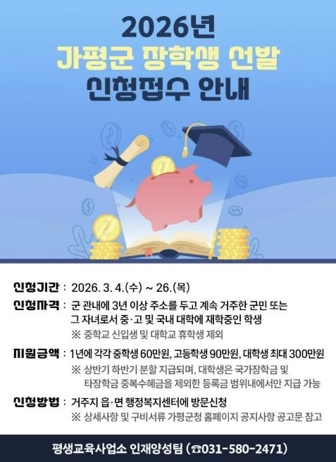 (포탈뉴스통신) 가평군이 지역 학생들의 균등한 교육 기회를 보장하고 우수 인재를 육성하기 위해 2026년도 장학생 선발에 나선다.