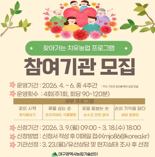 교육은 4월 7일 대구광역시농업기술센터 3층 강당에서 진행되며, 치유농업의 개념과 가치를 소개하고 마음챙김 치유농업 활동을 직접 체험할 수 있도록 구성된다.