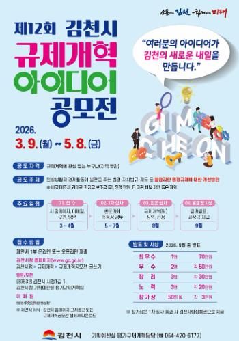 (포탈뉴스통신) 김천시는 시민의 아이디어를 바탕으로 일상생활과 기업활동 과정에서 발생하는 불합리한 규제를 개선하기 위해 제12회 규제개혁 아이디어 공모전을 개최한다.