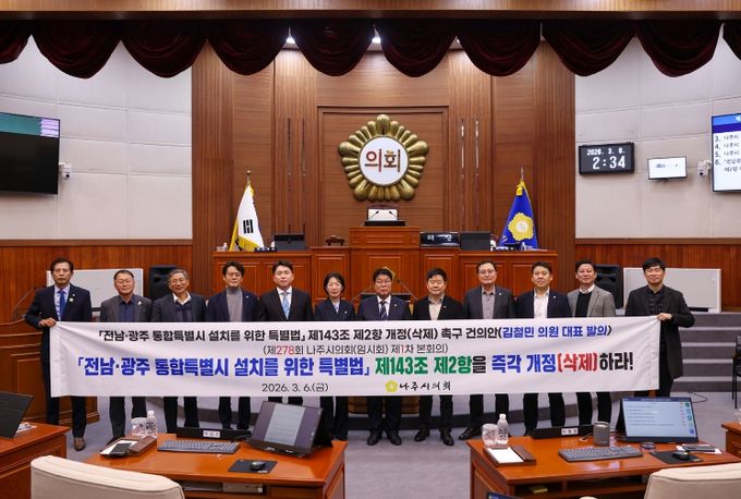 (포탈뉴스통신) 나주시의회는 3월 6일 제278회 임시회 제1차 본회의를 열고 ''전남광주통합특별시 설치를 위한 특별법' 제143조 제2항 삭제 촉구 건의안'을 채택했다.
