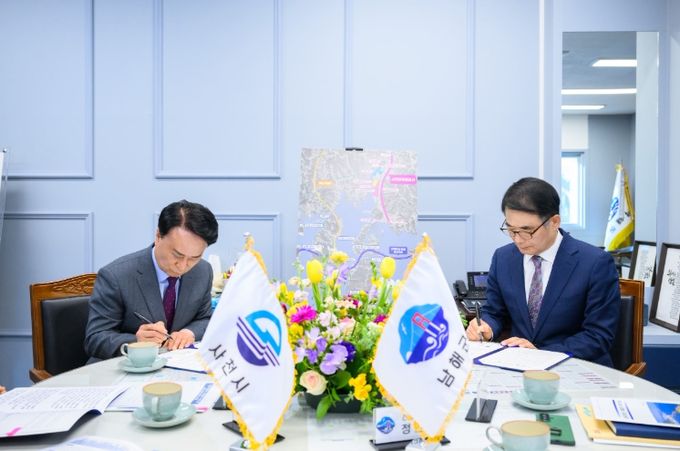장충남 남해군수와 박동식 사천시장은 6일 남해군청에서 ‘사천우주항공선 국가철도망 구축’을 위한 공동 건의문을 채택하고, 국토교통부가 수립 중인 ‘제5차(2026~2035) 국가철도망 구축계획’ 에 해당 노선의 반영을 공식 요청했다.