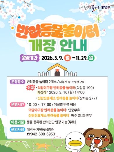 (포탈뉴스통신) 대전 대덕구에 반려동물과 보호자가 함께 이용할 수 있는 놀이터 두 곳이 문을 연다.