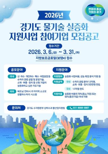 (포탈뉴스통신) 경기도가 ‘2026년 경기도 물기술 실증화 지원사업’ 참여 기업을 공개 모집한다.