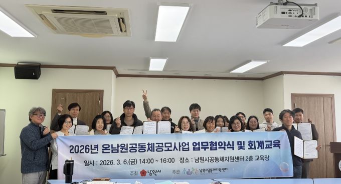 (포탈뉴스통신) 남원시공동체지원센터(센터장 안상연)는 지난 6일, ‘온남원공동체 공모 사업’에 선정된 13개 팀과 원활한 사업 추진과 향후 협력 증대를 위한 업무협약을 체결했다. 이날 협약식은 본격적인 사업 시작에 앞서 선정된 공동체들을 소개하고, 사업 운영 및 예산 사용에 관한 실무 교육을 병행하며 내실 있게 진행됐다.