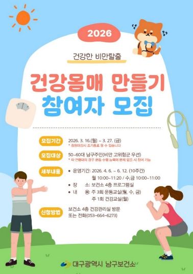 (포탈뉴스통신) 대구 남구는 오는 4월부터 지역주민의 신체활동 실천 활성화와 비만 예방을 위한 ‘2026년 비만탈출!건강몸매 만들기 교실’을 운영한다고 밝혔다.