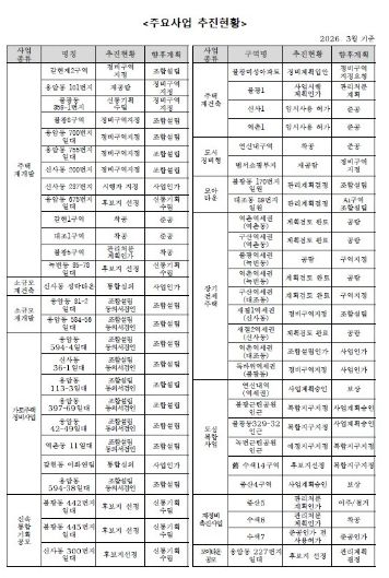현재 구 내 정비사업은 검토되고 있는 지역을 포함해 총 90여 개소가 속도감 있게 추진 중이다. 주택정비형 재개발, 도시정비형 재개발, 재건축, 도심공공주택 복합사업, 가로주택정비사업 등 유형도 다양하다. 중앙정부와 서울시의 주택공급 확대 정책에 따라 정비사업 제안과 추진 수요는 지속 증가하는 추세다.