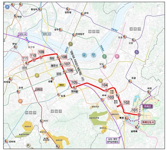 또한, 12월 개통 예정인 위례선 트램과의 연계를 통해 신도시와 서울 도심간 접근성을 향상시키고 위례중앙역과 신사역을 24분에 연결하여 기존 대비 32분 단축하는 등 이동시간도 절감할 것으로 기대된다.
