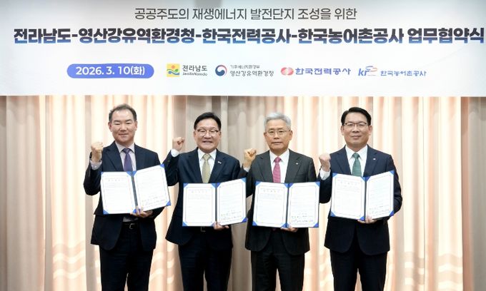 (포탈뉴스통신) 전라남도는 10일 한국전력공사 회의실에서 한국전력, 한국농어촌공사, 영산강유역환경청과 공공 주도 재생에너지 발전단지 조성과 안정적 전력 공급을 위한 업무협약을 했다.