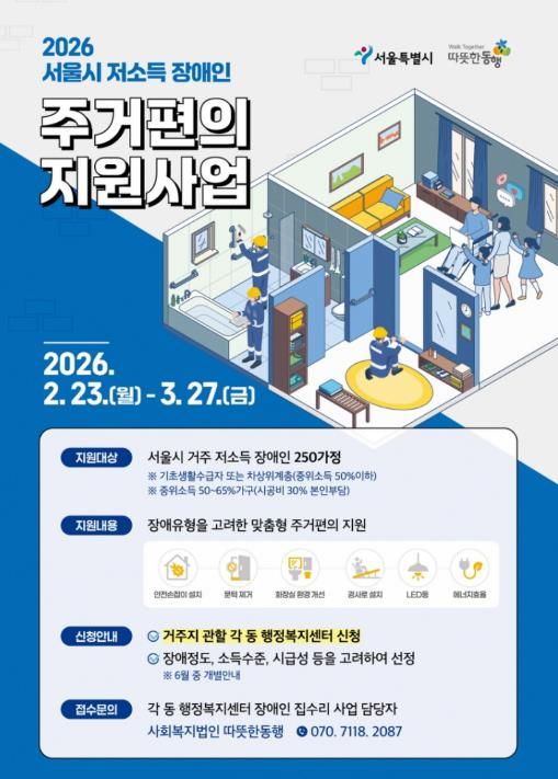 모집기간은 2월 23일부터 3월 27일까지이며, 서울시 전체 250가구를 지원할 예정이다. 신청 대상은 서울시에 거주하는 저소득 장애인으로 ▲ 기초생활수급자 ▲ 차상위계층 ▲ 한부모가족 등 복지 대상자이거나, 기준 중위소득 50~65% 가구 중 시공비의 30%를 본인이 부담할 수 있는 장애인이다.