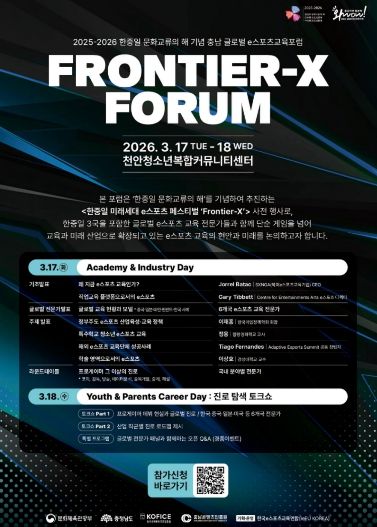 (포탈뉴스통신) 충남콘텐츠진흥원은 오는 3월 17일 ~ 18일 천안청소년복합커뮤니티센터에서 충남 글로벌 이스포츠 교육 포럼을 개최한다고 밝혔다.