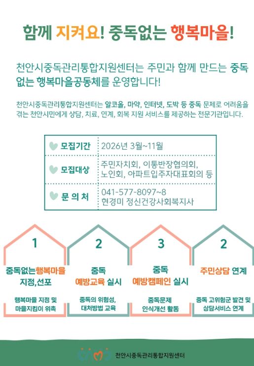 (포탈뉴스통신) 천안시중독관리통합지원센터는 올해 ‘함께 지켜요! 중독없는 행복마을’ 사업을 확대 추진한다고 11일 밝혔다.