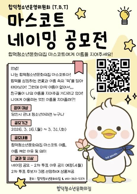마스코트 이름 공모는 온라인폼을 통해 진행되며, 청소년이라면 누구나 참여할 수 있다. 접수된 이름은 합덕청소년문화의집 청소년운영위원회의 심사를 통해 후보를 선정한 뒤, 최종 후보를 대상으로 온라인 투표를 진행하여 최종 마스코트 이름을 결정할 예정이다.