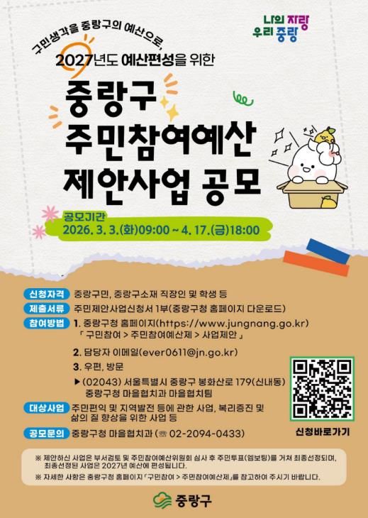 (포탈뉴스통신) 중랑구가 2027년도 예산에 반영할 주민참여예산 사업을 발굴하기 위해 오는 3월 3일부터 4월 17일까지 총 11억 원 규모의 주민참여예산 제안사업 공모를 실시한다.