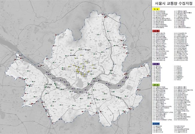 교통량은 서울 시내 주요도로 134개 지점에서 조사했으며, 통행속도는 510개 주요도로를 주행한 택시 위치정보(GPS)와 도시고속도로 내 설치된 1,153대의 지점 검지기 데이터 활용해서 산출했다.