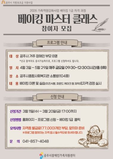(포탈뉴스통신) 공주시장애인가족지원센터(센터장 이영식)는 오는 3월 20일까지 장애인 부모를 대상으로 베이킹 1급 자격 과정인 ‘베이킹 마스터 클래스’ 참여자를 모집한다고 밝혔다.