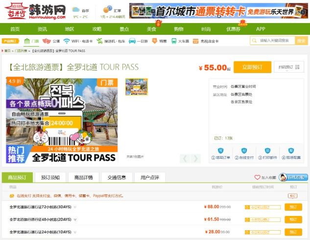 한유망은 중국 내에서 한국 여행 정보와 관광상품을 제공하는 주요 온라인 플랫폼으로, 이번 연계 판매를 통해 전북투어패스 통합권을 비롯해 전주 한옥마을권, 경기전 및 광한루원 단독권 등 외국인 관광객 선호도가 높은 관광상품이 현지에서 판매된다.