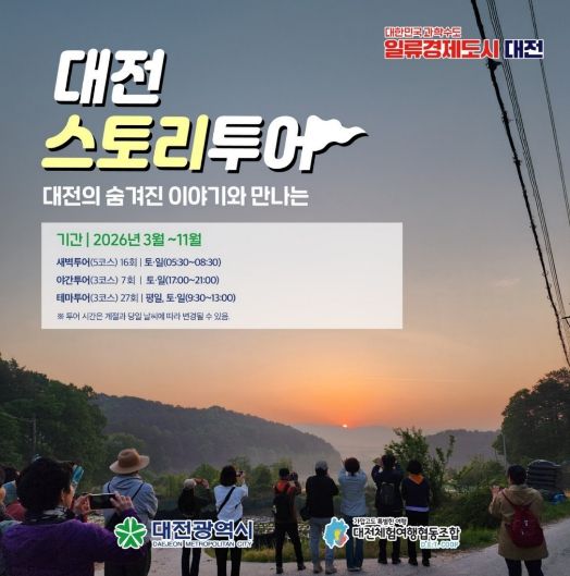 박승원 대전시 문화예술관광국장은 “2026 대전스토리투어는 자연․역사․문화에 이야기를 입혀 시민과 관광객이 도시를 새롭게 만날 수 있도록 기획한 대전형 관광 프로그램”이라며, “새벽의 감성, 밤의 매력, 마을과 인물의 스토리를 더욱 촘촘하게 담아 오래 기억에 남는 여행 경험을 선사하겠다”라고 밝혔다.
