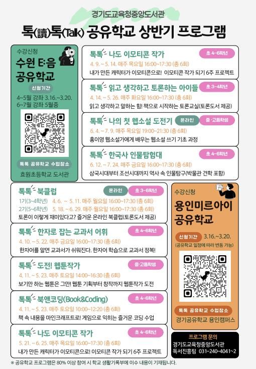 (포탈뉴스통신) 경기도교육청중앙도서관이 학생들의 창의적 사고력과 진로설계 역량을 강화하기 위해 4월부터 7월까지 녪년 상반기 톡(讀)톡(talk) 공유학교’를 운영한다.