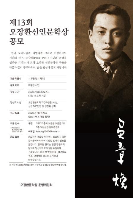 (포탈뉴스통신) 충북 보은군과 오장환 문학상 운영위원회는 한국 모더니즘과 리얼리즘, 아방가르드 시단의 선구자로 평가받는 오장환(1918~1951) 시인의 문학 정신을 기리고 유망한 신인 시인을 발굴하기 위해 ‘제13회 오장환 신인문학상’ 작품을 공모한다.
