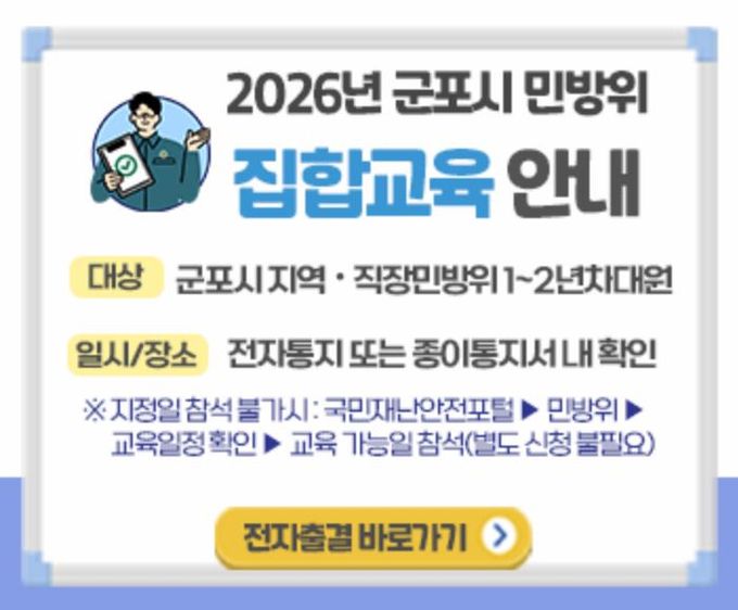 (포탈뉴스통신) 군포시는 민방위대원의 비상 시 대응 역량 강화를 위해 ‘2026년 민방위 기본교육’을 실시한다.
