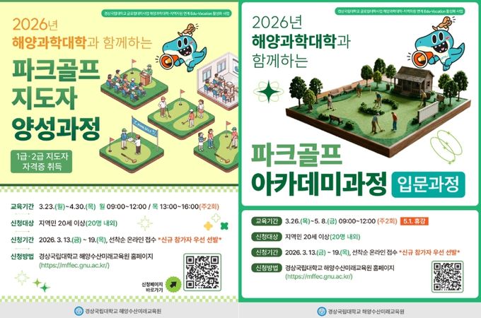 (포탈뉴스통신) 경상국립대학교 해양과학대학 해양수산미래교육원은 3월 23일부터 ‘파크골프 지도자 양성과정(1급·2급 지도자 자격증 취득) 및 파크골프 아카데미’ 2개 과정을 운영한다.
