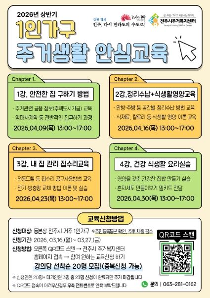 (포탈뉴스통신) 전주시 주거복지센터(센터장 오은주)는 1인 가구의 안정적이고 독립적인 주거 정착을 돕기 위해 오는 4월 9일부터 30일까지 매주 목요일 오후 1시부터 약 4시간 동안 전주시 실거주 1인 가구를 대상으로 ‘2026년 상반기 1인 가구 주거생활 안심교육’을 운영한다.