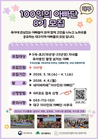 (포탈뉴스통신) 대구광역시는 아빠들의 적극적인 육아 참여를 독려하고 함께 육아하는 사회 분위기를 확산하기 위해 3월 18일부터 ‘2026년 제8기 대구 100인의 아빠단’ 활동 단원을 모집한다.