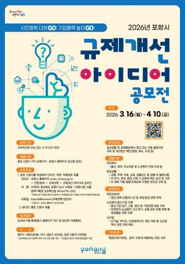 (포탈뉴스통신) 포항시는 일상생활과 경제활동에 불편을 주는 불합리한 규제를 시민과 함께 발굴하고 개선하기 위해 3월 16일부터 4월 10일까지 ‘2026년 포항시 규제개선 아이디어 공모전’을 개최한다.