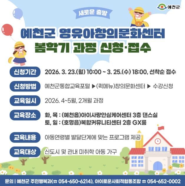 (포탈뉴스통신) 예천군은 관내 영유아의 건강한 성장과 창의력 발달을 지원하기 위해 예천군 영유아 창의문화센터 봄학기 프로그램 수강생을 모집한다.